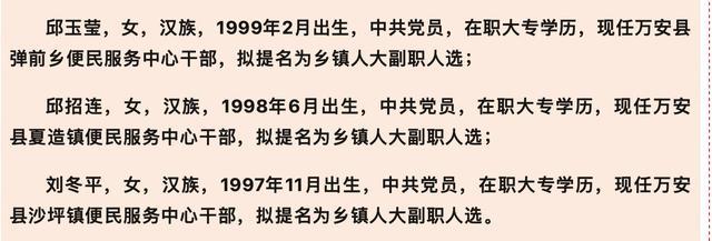 近日按天配资自动延期,江西吉安市万安县委组织部发布一则干部任前公示,其中包括3名“95后”年轻女干部,拟提名乡镇人大副职,均为在职大专学历,引发广泛热议。
